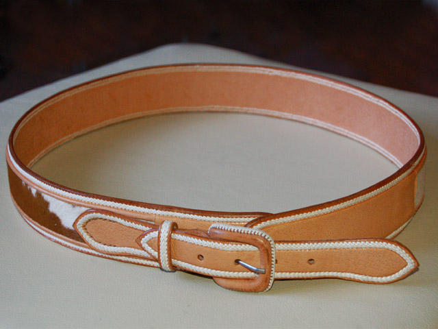 Cinturón de cuero negro y bayo confeccionada artesanalmente. Reforzado con tiento en las orillas. Hebilla forrada. Ancho: 3,5 - 4 - 5 cms. Largo: 105 - 120 cms.